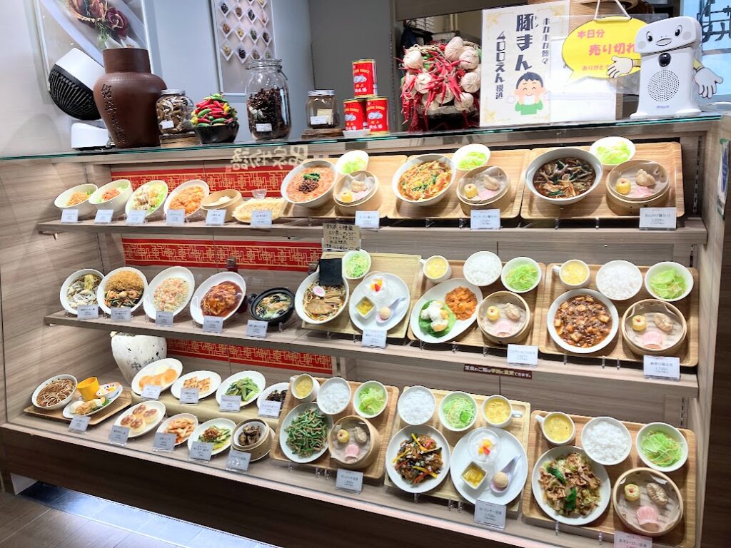 点心やエビたっぷりの中華がずらりと並んだフードサンプル、行列ができてました。