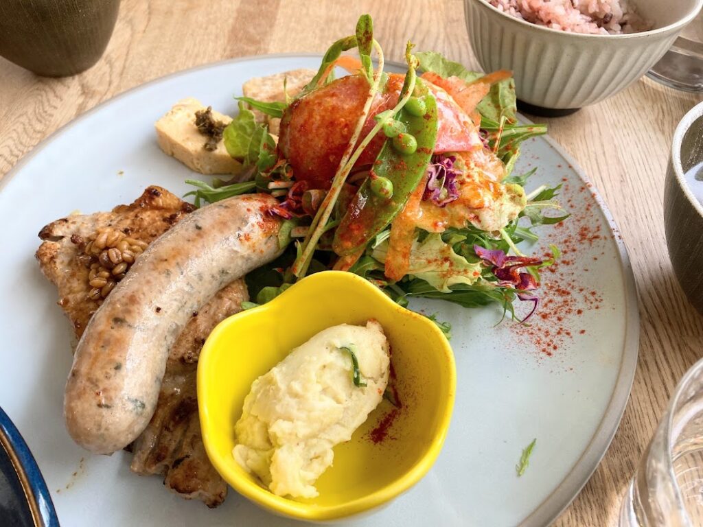 友人のMさんは「ランチセットA:飯山みゆきポークソテー醤麹仕立てと日代わりソーセージプレート」。