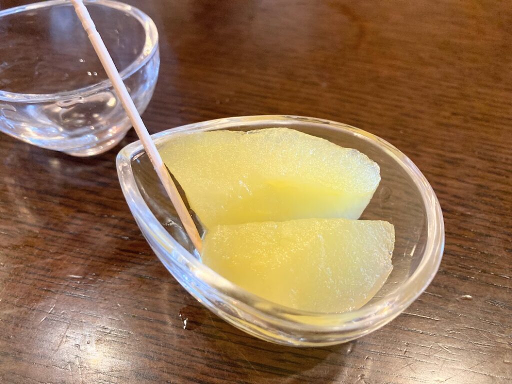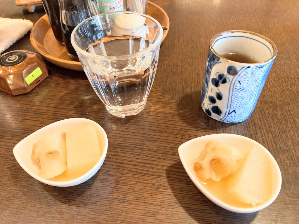 ということで?、お席につくと、お茶とお通しのおでんをお持ちいただきました。